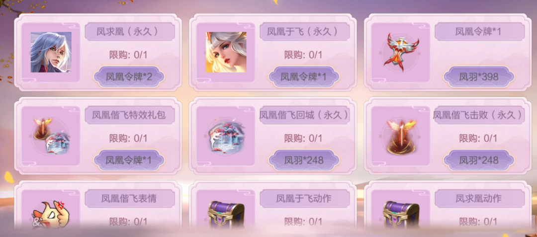 兑换凤求凰皮肤需要2个令牌,兑换凤凰于飞皮肤则需要1个凤凰令牌。【凤凰令牌】本身也可以在这个兑换商店里用【凤羽】兑换,398个凤羽即可兑换一个令牌。也就是说,796个凤羽可兑换1个永久凤求凰皮肤。