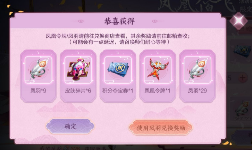 【凤凰令牌】和【凤羽】可以在兑换商店内兑换包括【凤凰于飞、凤求凰】皮肤在内的其他道具奖励,比如回城特效,或者击败特效,动作,或是皮肤碎片、皮肤点券抵扣卡等等。
