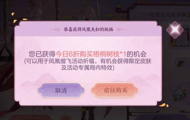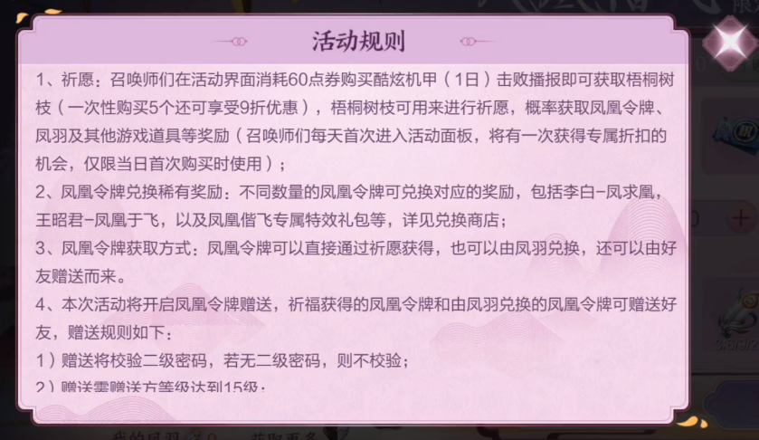 【梧桐树枝】和以往的【红宝石】一样,是抽奖祈愿道具,用来进行此次返场的活动抽奖。抽奖可概率获得【凤凰令牌】、【凤羽】,以及其他的一些奖励道具。