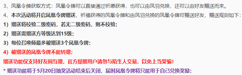 凤凰令牌也是可以好友之间互相赠送的,但被赠送的令牌不能转赠。【凤羽】除了祈愿获得,也可以在【凤羽加油站】中,参与活动,获得一定数量的产出。
