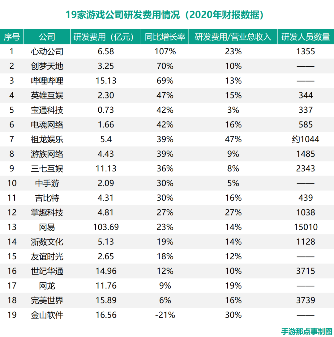 那么现在游戏公司的研发费用和团队规模大概处在怎样的水平?手游那点事统计了19家游戏公司的相关数据(按研发费用同比增长率由高到低排序),表格如下: