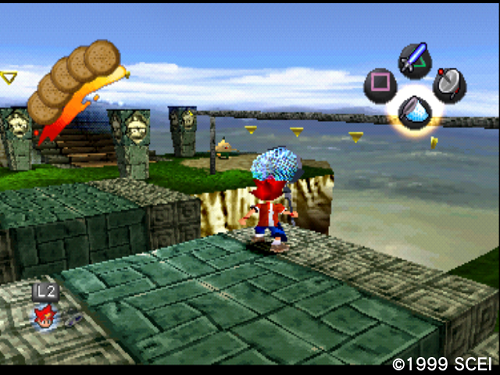 1999年5月,SCEJ重要的代表作《捉猴啦》问世。因为猴子们已经有了高度智慧,想要侵略地球,玩家扮演一个需要四处抓捕哔波猴来拯救世界的小男孩。作为3D..游戏,《捉猴啦》游戏目的单纯、玩法新颖、风格活泼,适合全年龄段玩家感受游戏乐趣,关卡、音乐设计等也有相当水准,是PS上最重要的3D..游戏之一。此外,《捉猴啦》还带着普及双摇杆手柄DualShock操作习惯的使命,很多玩家正是通过《捉猴啦》认识到新手柄游玩3D游戏的优势。