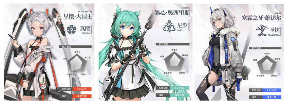 人物原画设计上,我们不难发现游戏融合了近几年来在二次元圈子里流行的风格,比如充满未来感和科技感的朋克机能风,这一点在服饰(尤其是外套/冲锋衣)上体现的尤为明显。另外,以多文明的神格名称来命名角色,也成了游戏中创造角色特征、划分阵容的重要元素。