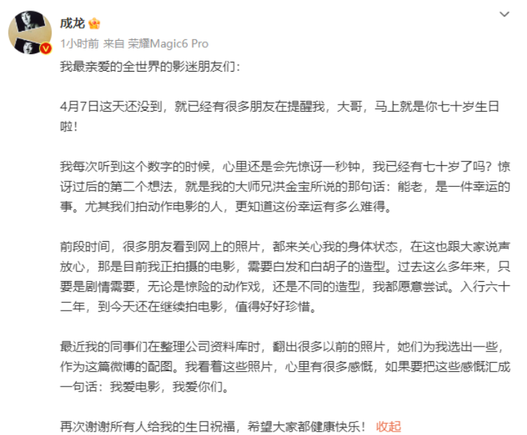 曾经用精湛的表演征服无数观众的成龙年老,竟然已经年满70岁了。4月7日,成龙发文庆贺本身70岁生日,文中透露:能老是一件幸运的事,请人人宁神我的身体。