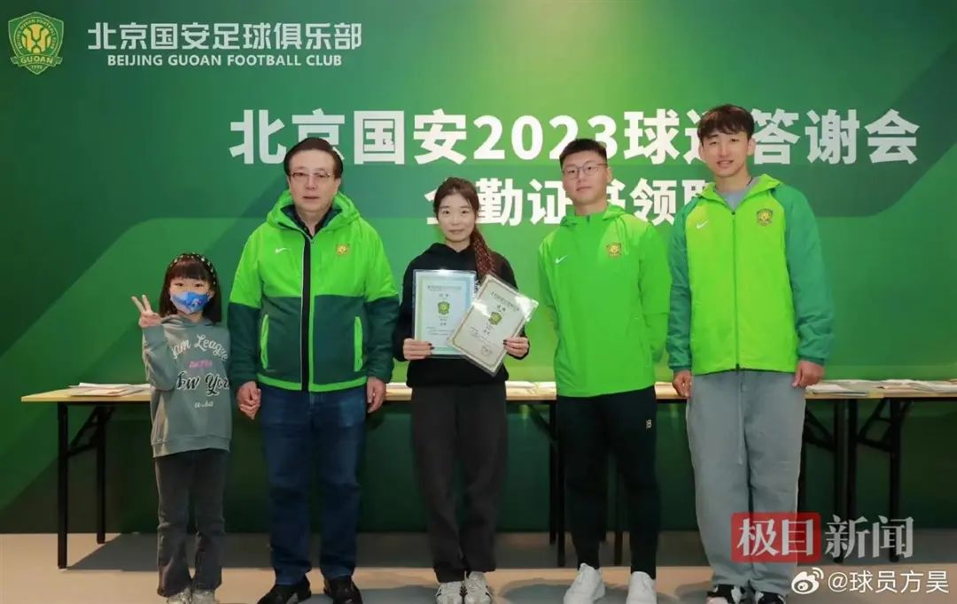 ▲杨雪(左三)2023年获颁国安“全勤奖”。(图片起原:方昊微博)