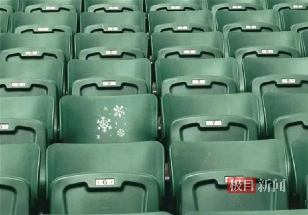 4月3日,北京工体绿色的看台上,一张座椅被喷涂了几朵雪白的雪花。