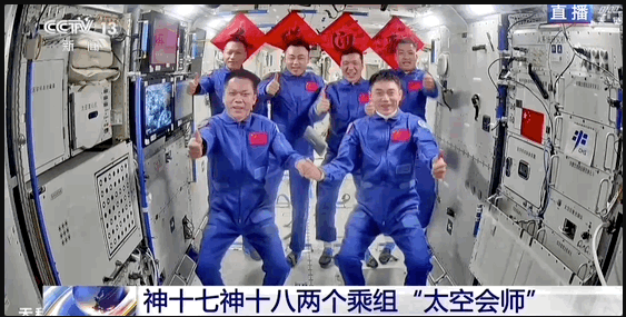 在载人飞船与空间站组合体成功实现自主快速交会对接后,神舟十八号航天员乘组从飞船返回舱进入轨道舱。北京时间 2024 年4月26日5时04分,在轨执行任务的神舟十七号航天员乘组顺利打开“家门”,欢迎远道而来的神舟十八号航天员乘组入驻“天宫”。随后,两个航天员乘组拍下“全家福”,共司向牵挂他们的全国人民报平安。