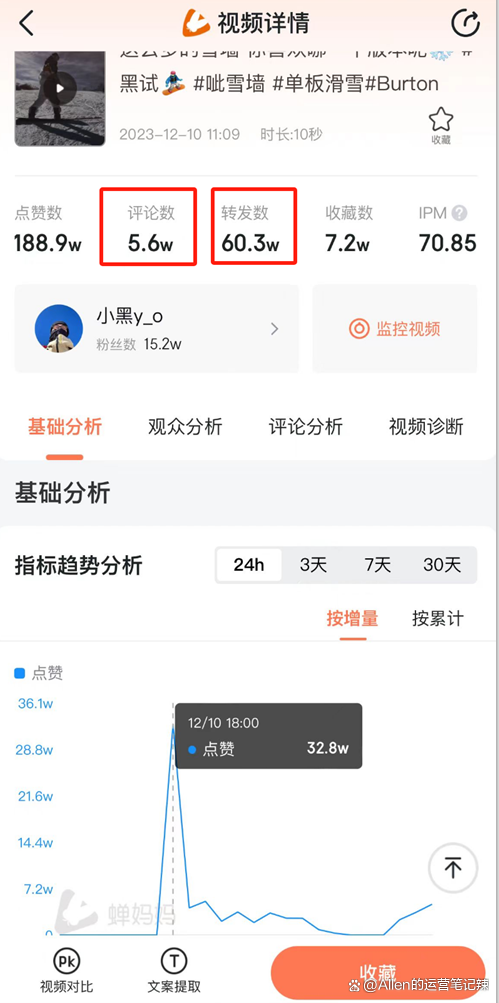 比如以下这个视频,转发数和评论数都很不错。我们就可以判定为该视频适合投DOU+。