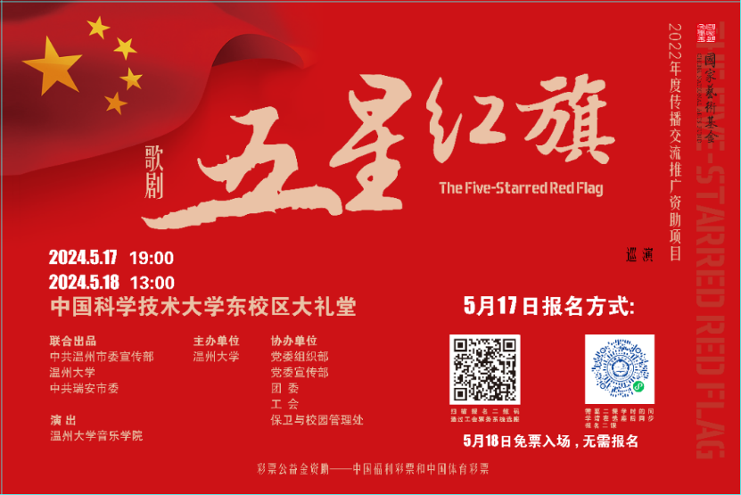 今年是中华人民共和国成立75周年,为深入推进党史学习教育常态化长效化,我校将于5月17日晚在东区大礼堂举办原创歌剧《五星红旗》校园巡演活动。