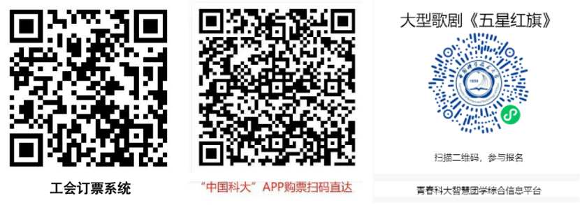 本场演出通过工会订票系统预约,每人限订2张,按座位就坐(可扫描下方二维码跳转订票);也可进入“中国科大APP”工作台上方搜索“票务服务”,点击该功能进入工会订票系统预约订票(可扫描下方二维码下载APP)。本次演出纳入第二课堂,需要计入二课学时的同学需在工会订票系统订票后,进入“青春科大智慧团学综合信息平台”报名(可扫描下方二维码报名)。