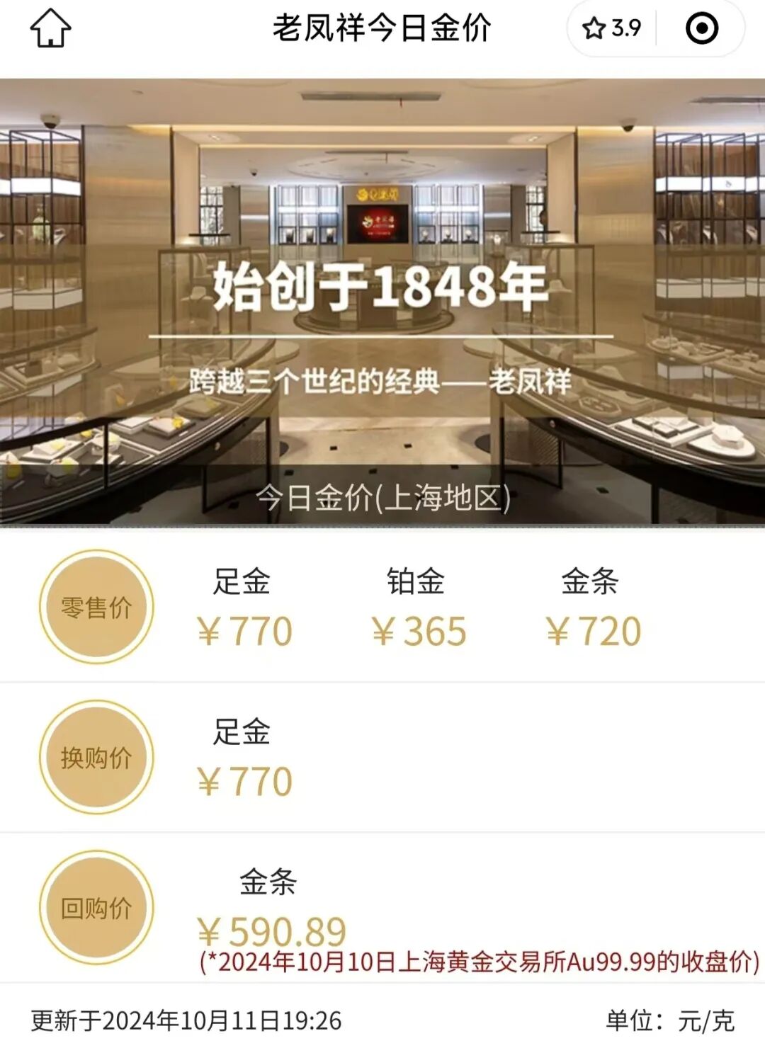 老凤祥10月11日金价 ↑